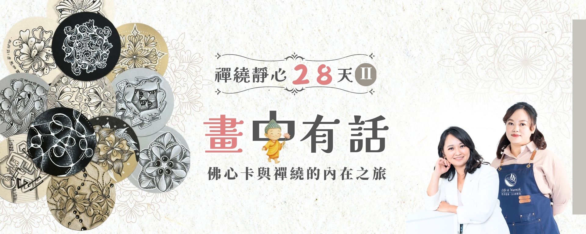 《畫中有話|28 天英雄之旅禪繞創作》 是一段以線條為媒介的創作歷程。每天 30 分鐘,在放下批判與緊繃的狀態下,跟隨清楚的順序與主題,透過解構禪繞線條,循序走過內在英雄之旅的不同階段。課程結合佛心卡所承載的生命歷程,引導你在放鬆而專注的創作節奏中,完成一冊可回看的創作記錄,標記自己真實走過的一段內在旅程。